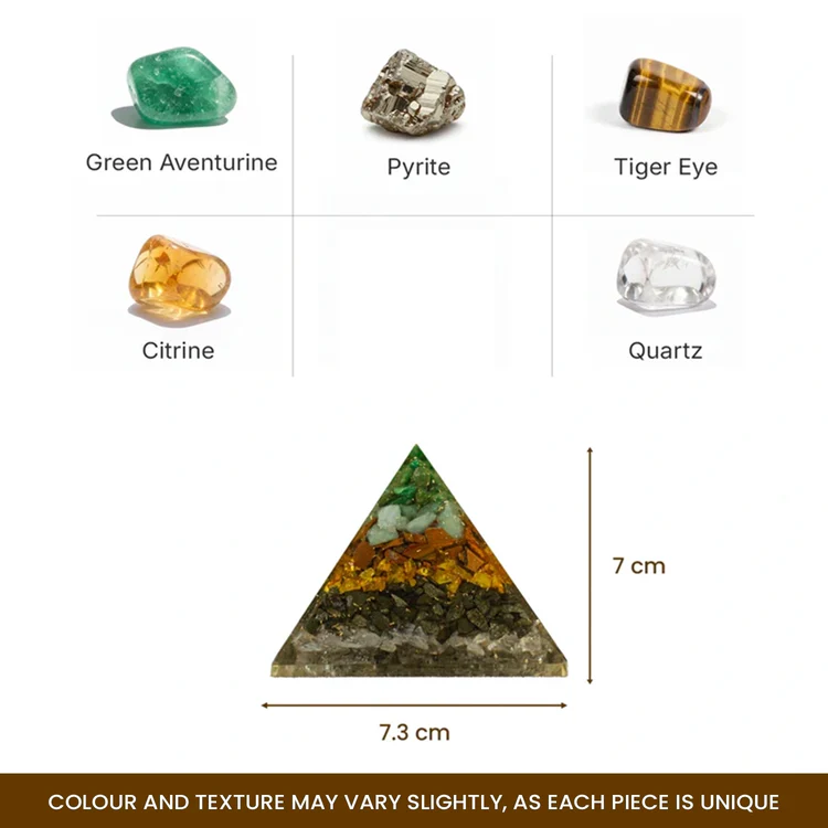 The Dhan Yog Pyramid has strong crystals that bring money, good health, business growth, peace of mind, and remove problems. Each crystal adds its own special energy: Pyrite – Linked with Lord Kubera, the God of wealth. It attracts money and protects from negative energy. Tiger Eye – Connected to Lord Shiva. It gives courage, boosts confidence, and helps you make strong decisions. Citrine – Guided by Lord Vishnu. It clears your mind and supports smart money and career choices. Quartz – Linked with Maa Saraswati. It increases the power of other stones by 10x and brings clarity. Green Aventurine – Blessed by Lord Ganesha. It removes obstacles, opens new chances, and brings success